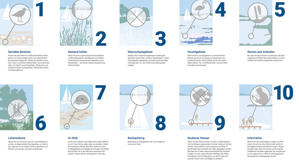 Die „10 Goldenen Regeln“ des Deutschen Segler-Verbands (DSV) sind ein Verhaltenskodex für Wassersportler zum Schutz der Natur.