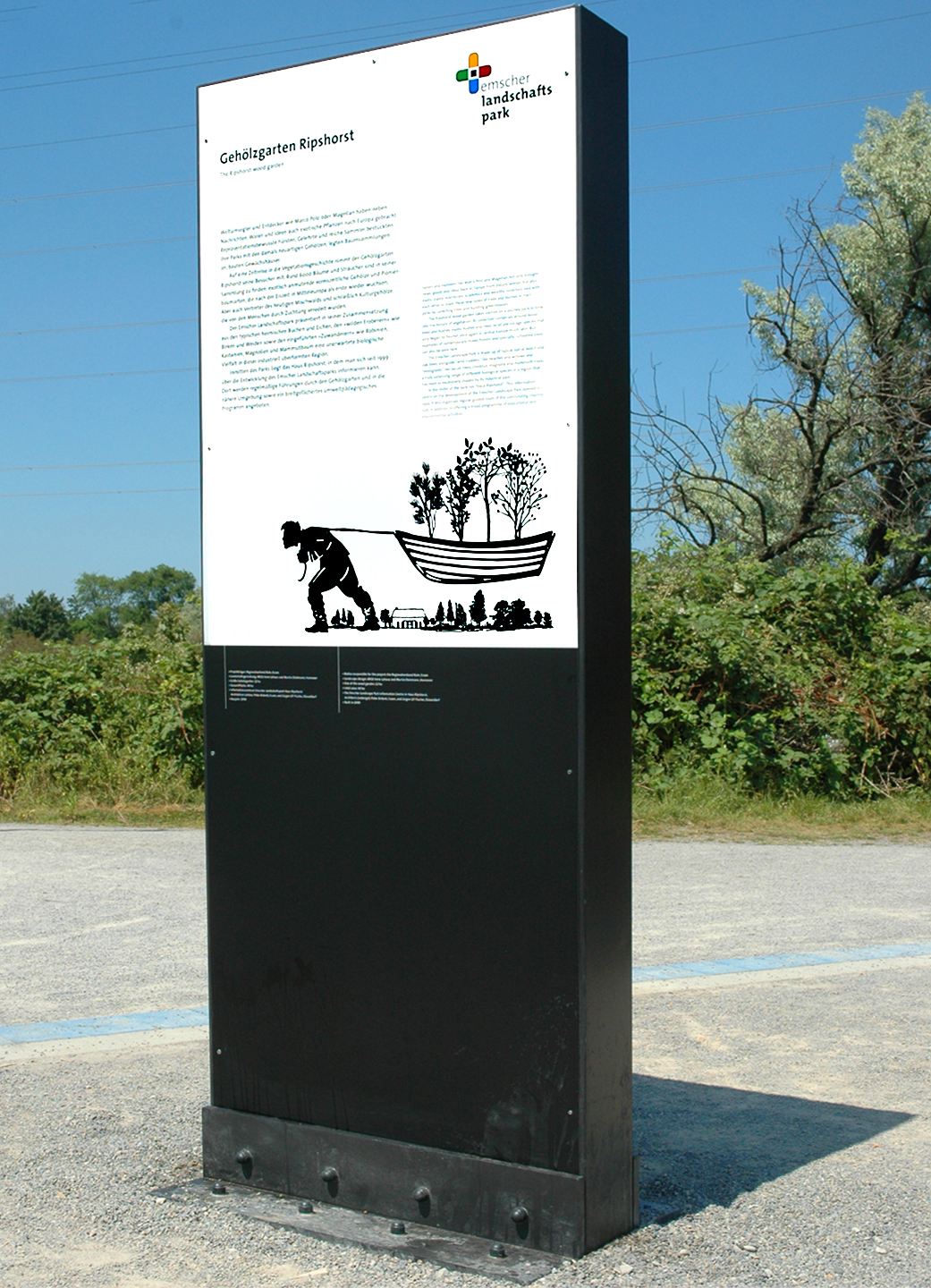 > Die Infotafeln sind kunstvoll in Form von Brammen gestaltet, was ihnen eine besondere industrielle Note verleiht. Eine der Flächen zeigt eine meiner 24 Illustrationen, die die Geschichte und Atmosphäre des Ortes im Bild thematisiert. Auf der gegenüberliegenden Seite erfährt man in kurzen, informativen Fakten etwas über den Emscher Landschaftspark und seine Geschichte.