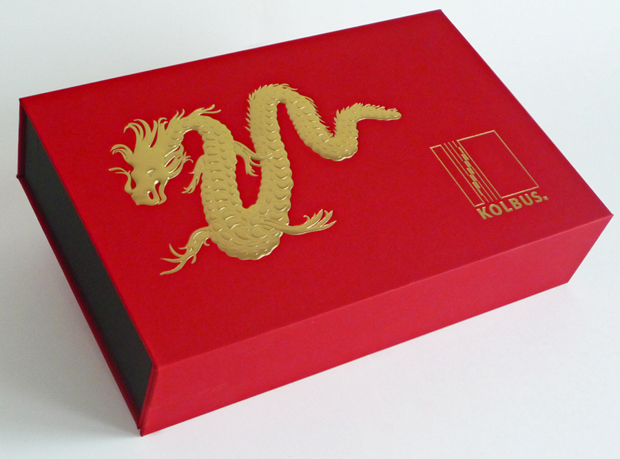 Übergabe-Schachtel zur Messe ›All in Print/Shanghai, Illustration für eine Produktverpackung, umgesetzt mit strukturierter Reliefprägung und Prägefoliendruck Gold
